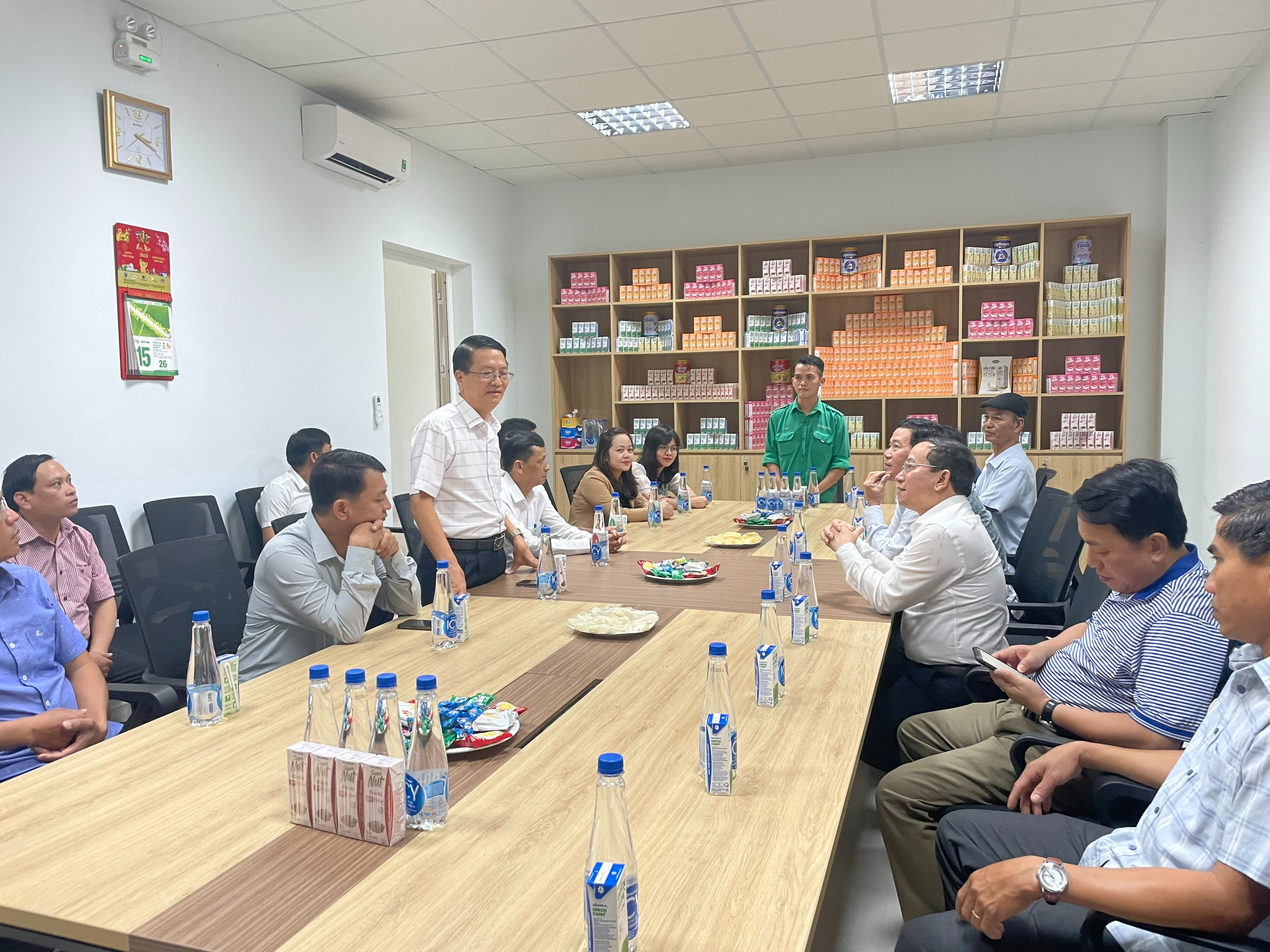 Đ/c Phạm Ngọc Lân - Phó Bí thư, Chủ tịch UBND huyện Mộ Đức thông tin nhanh với Đoàn công tác huyện Hải Lăng về tình hình sản xuất Trang trại Bò sữa của Vinamilk tại Quảng Ngãi