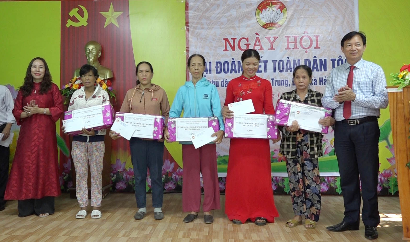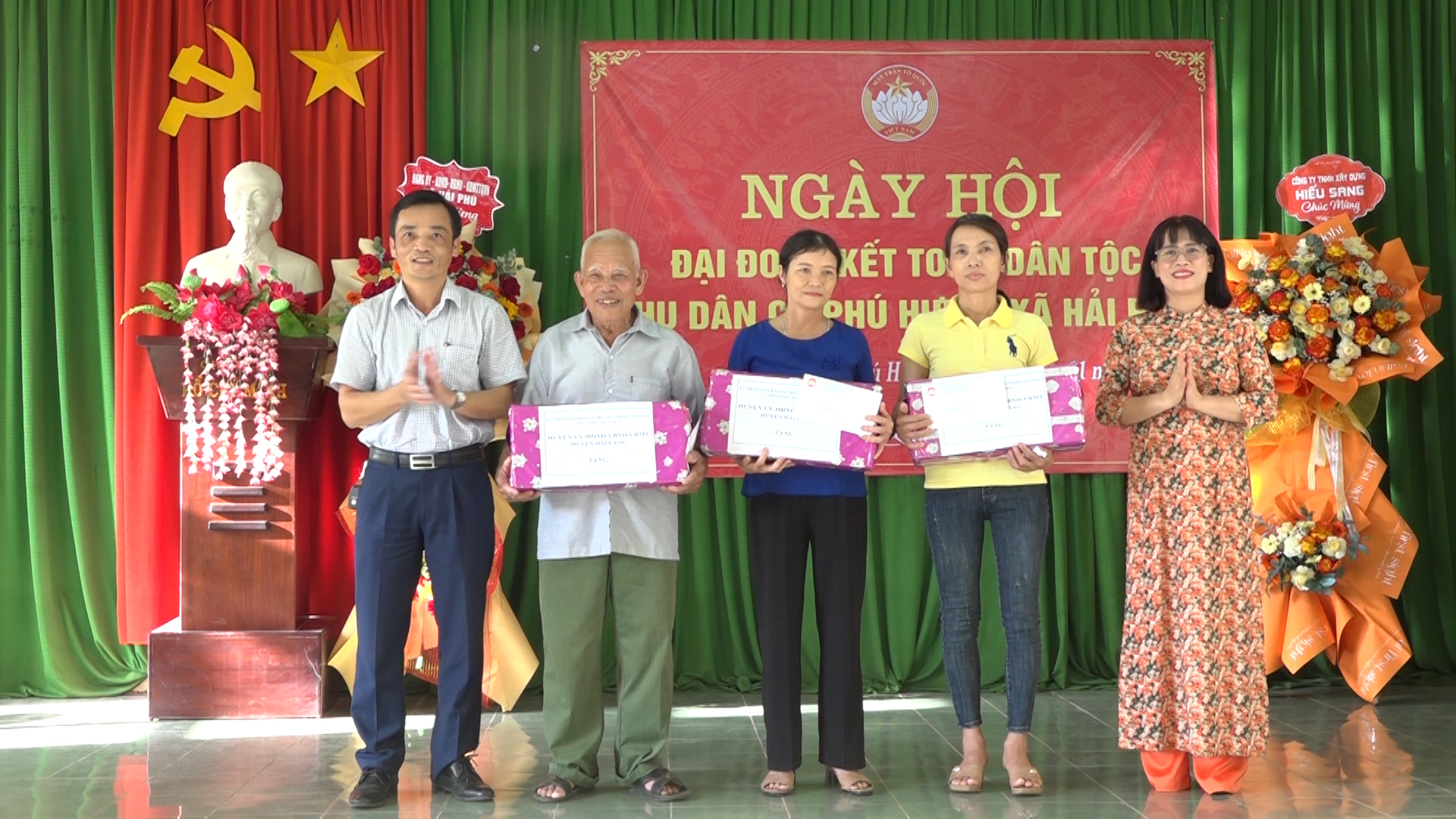 Tại xã Hải Trường, đồng chí Hoàng Thị Phương Nam, Phó Bí thư Thường trực Huyện uỷ cùng các đồng chí đại biểu đã về tham dự ngày hội Đại đoàn kết toàn dân tộc liên khu dân cư Hậu Trường, Mỵ Trường, Trung Trường, Đông Trường. Liên khu dân cư Hậu Trường, Mỵ Trường, Trung Trường, Đông Trường có 1.199 hộ với 6.034 nhân khẩu, các khu dân cư đều có hợp tác xã. Năm 2023 có 95% hộ gia đình được công nhận gia đình văn hoá. Trong thời gian qua, liên khu dân cư đã đoàn kết thực hiện tốt các phong trào thi đua yêu nước, phát triển kinh tế, xóa đói giảm nghèo, xây dựng đời sống văn hoá, chăm lo sự nghiệp giáo dục, phát triển nguồn nhân lực chăm sóc sức khoẻ nhân dân, phát huy truyền thống đền ơn đáp nghĩa, tương thân tương ái; bảo vệ môi trường, ứng phó biến đổi khí hậu, xây dựng cảnh quan môi trường sáng, xanh, sạch đẹp; chấp hành pháp luật, đảm bảo trật tự an toàn xã hội; phát huy dân chủ, tham gia giám sát và phản biện xã hội, góp phần xây dựng hệ thống chính trị cơ sở trong sạch, vững mạnh. Tại ngày hội, Huyện uỷ - HĐND – UBND – UBMTTQVN huyện đã trao tặng 8 suất quà cho các hộ gia đình có hoàn cảnh khó khăn, xã Hải Trường trao tặng 30 suất quà và Sư cô Thích Nữ Huệ Tín, trụ trì chùa Tịnh Đức trao tặng 50 suất quà trị giá 300.000 đồng cho những gia đình có hoàn cảnh khó khăn.