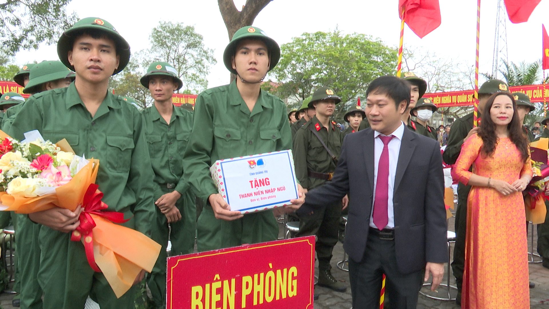 Đ/c Đào Mạnh Hùng-Ủy viên BTV Tỉnh ủy, Chủ tịch UBMTTQVN tỉnh và đ/c Ly Kiều Vân- Ủy viên BTV, Trưởng Ban Nội chính Tỉnh ủy tặng quà cho tân binh