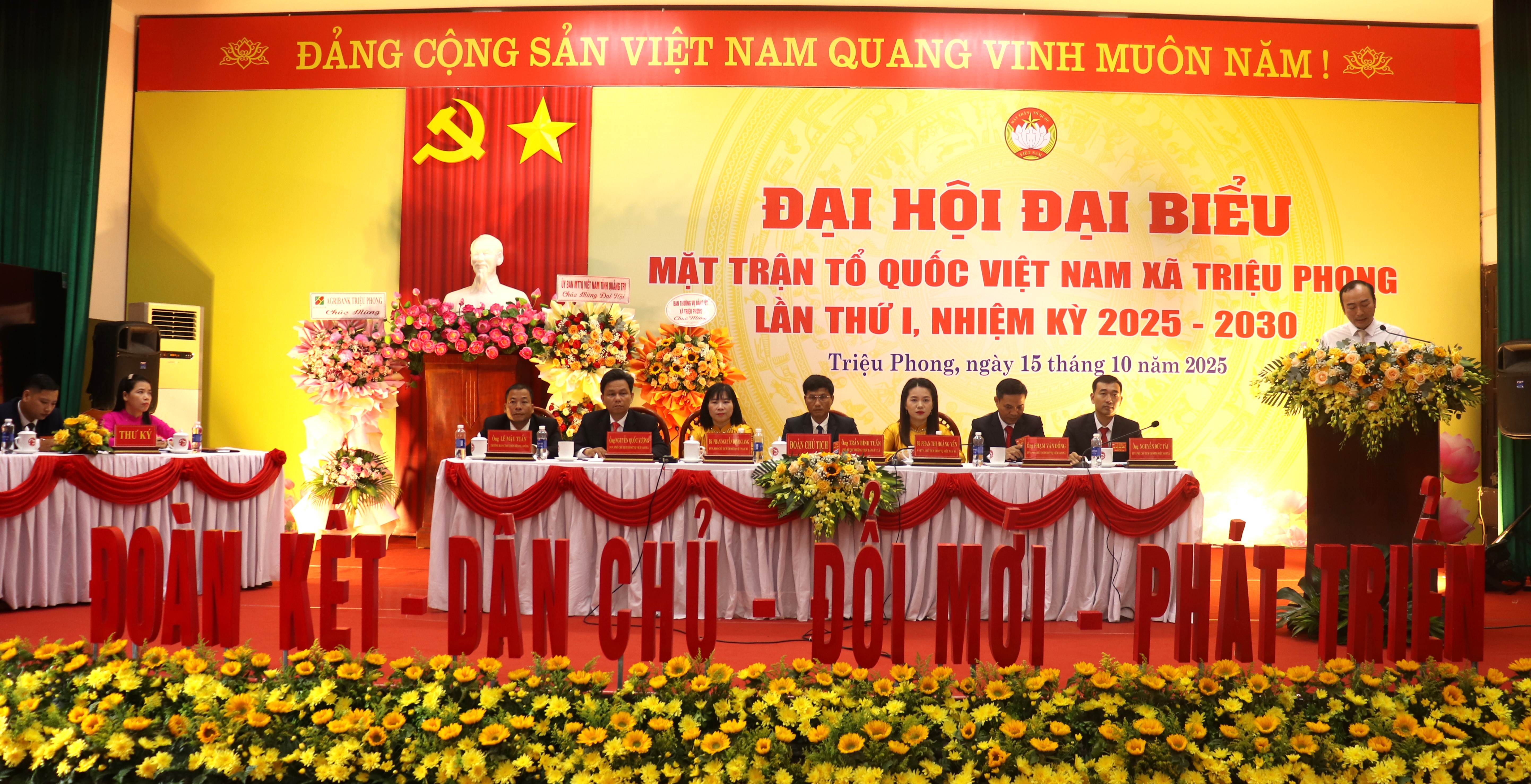 Sáng 15/10/2025, Ủy ban MTTQ Việt Nam xã Triệu Phong long trọng tổ chức Đại hội đại biểu lần thứ I, nhiệm kỳ 2025–2030. Tham dự Đại hội có đồng chí Lê Thị Mỹ Hiền – Phó Chủ tịch Ủy ban MTTQ Việt Nam tỉnh Quảng Trị cùng các đồng chí lãnh đạo tỉnh. Về phía xã Triệu Phong có đồng chí Nguyễn Văn Thành - Bí thư Đảng ủy, chủ tịch HĐND xã; đồng chí Trần Bình Tuấn - Phó Bí thư Thường trực Đảng ủy; đồng chí Đặng Sỹ Dũng - Phó Bí thư Đảng ủy, Chủ tịch UBND xã, các đồng chí trong BTV, BCH Đảng ủy, HĐND, UBND xã Triệu Phong cùng 113 đại biểu đại diện cho các tầng lớp Nhân dân trong xã.