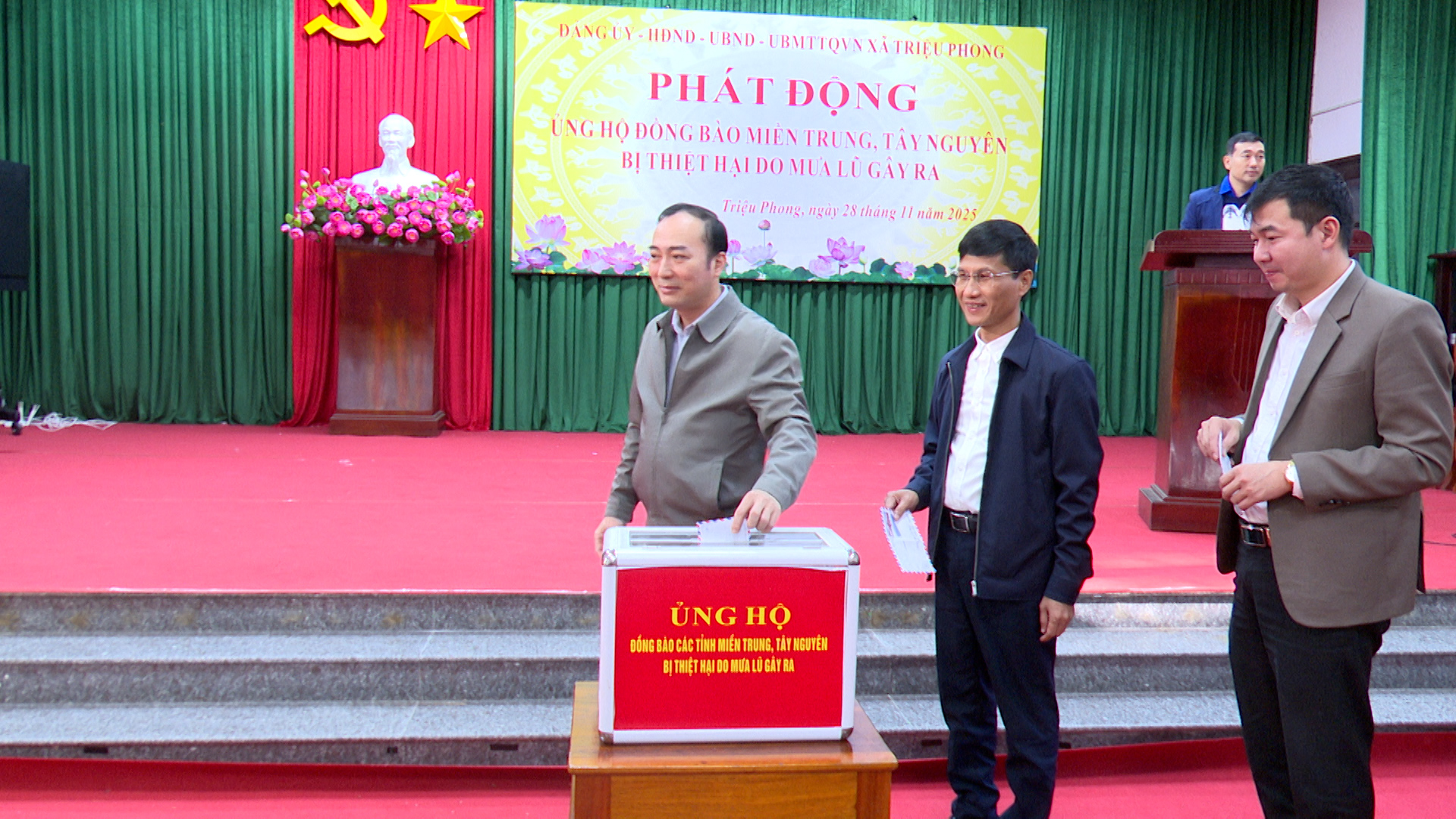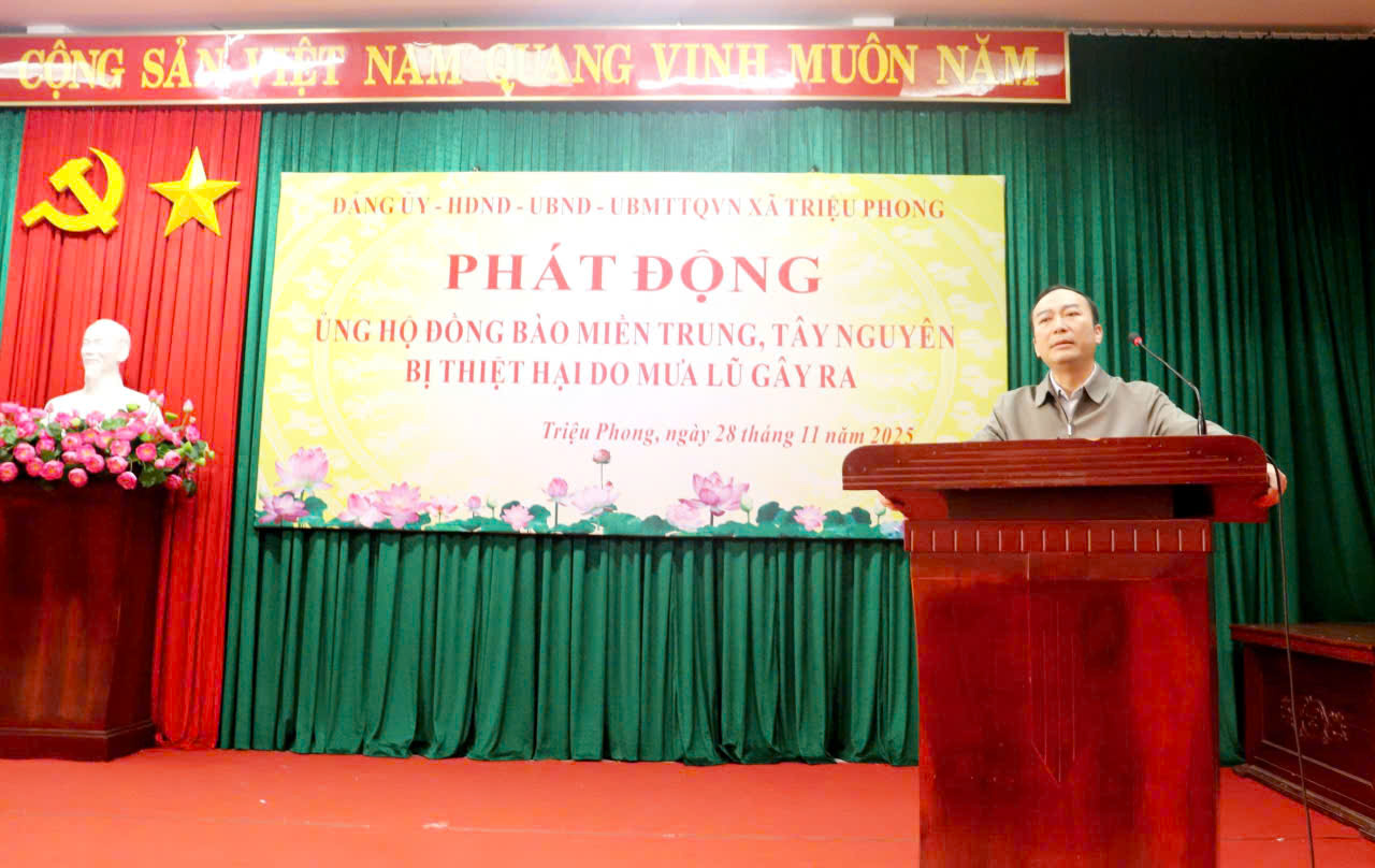 Hưởng ứng lời kêu gọi của Ban Thường trực Ủy ban MTTQ Việt Nam tỉnh Quảng Trị, sáng ngày 28/11/2025, Đảng ủy, HĐND, UBND và Ủy ban MTTQ Việt Nam xã Triệu Phong tổ chức lễ phát động, kêu gọi cán bộ, công chức, viên chức, các doanh nghiệp, nhà hảo tâm và toàn thể Nhân dân trên địa bàn chung tay hỗ trợ đồng bào miền Trung và Tây Nguyên khắc phục hậu quả mưa lũ.