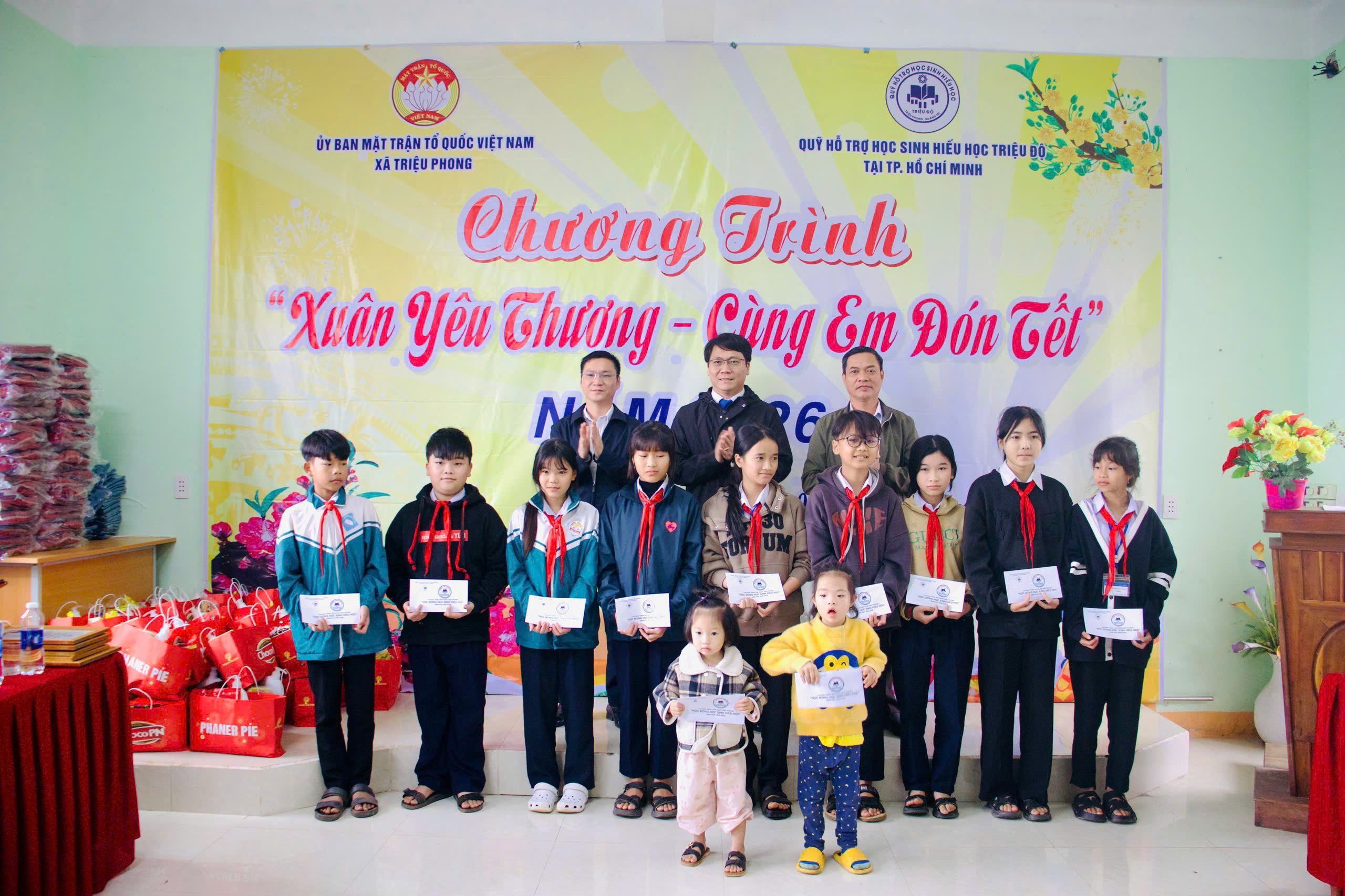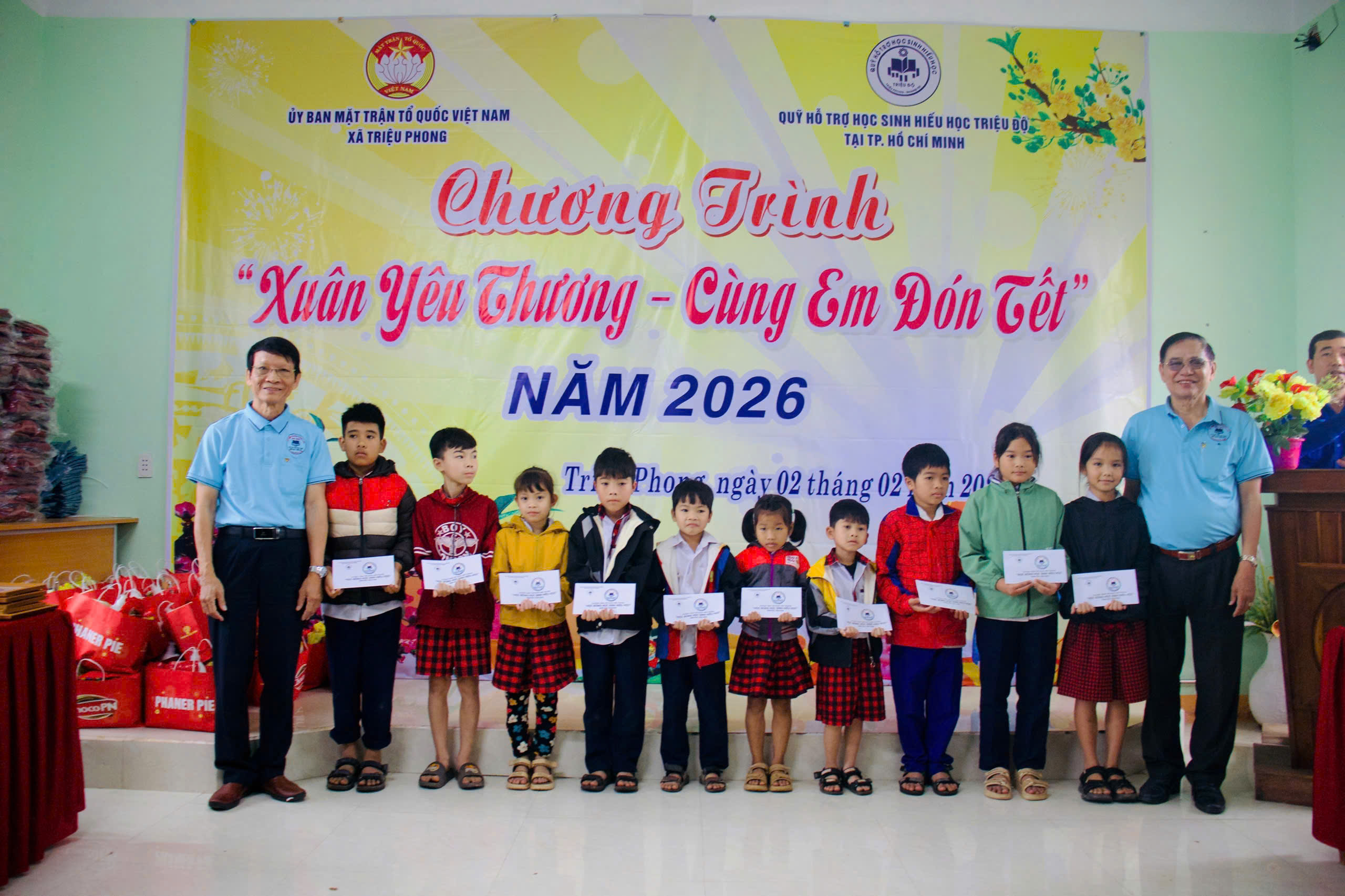 Nhân dịp Tết Nguyên đán, với tinh thần sẻ chia, yêu thương và trách nhiệm cộng đồng nhằm tiếp thêm niềm tin và động lực để các em học sinh vươn lên trong học tập, được đón một mùa xuân ấm áp, nghĩa tình. Sáng ngày 02/02/2026, UBMTTQVN xã Triệu Phong phối hợp với Qũy hỗ trợ học sinh hiếu học Triệu Độ (Tp. Hồ Chí Minh) tổ chức Chương trình “Xuân yêu thương - Cùng em đón Tết” năm 2026 dành cho giáo viên và học sinh tại điểm trường Trấm (Trường Tiểu học & THCS Triệu Thượng).