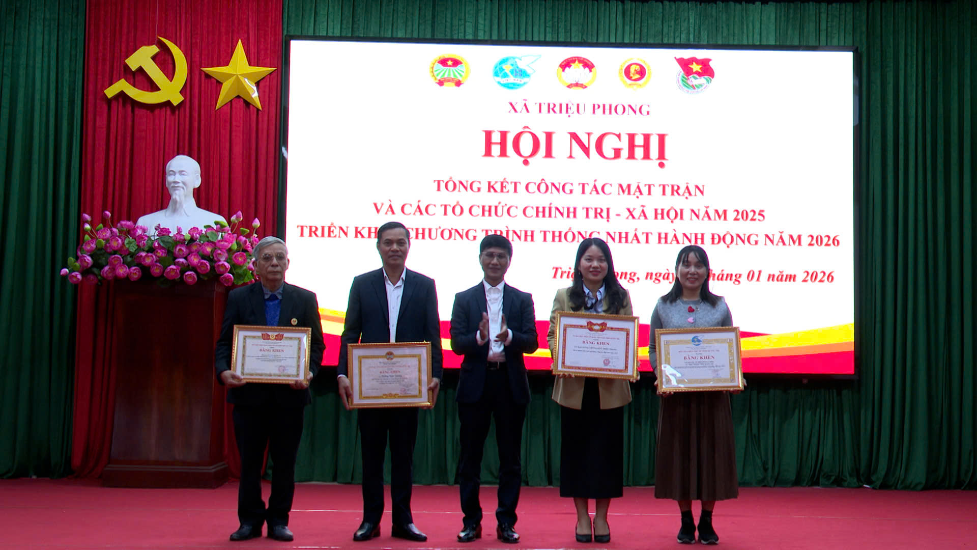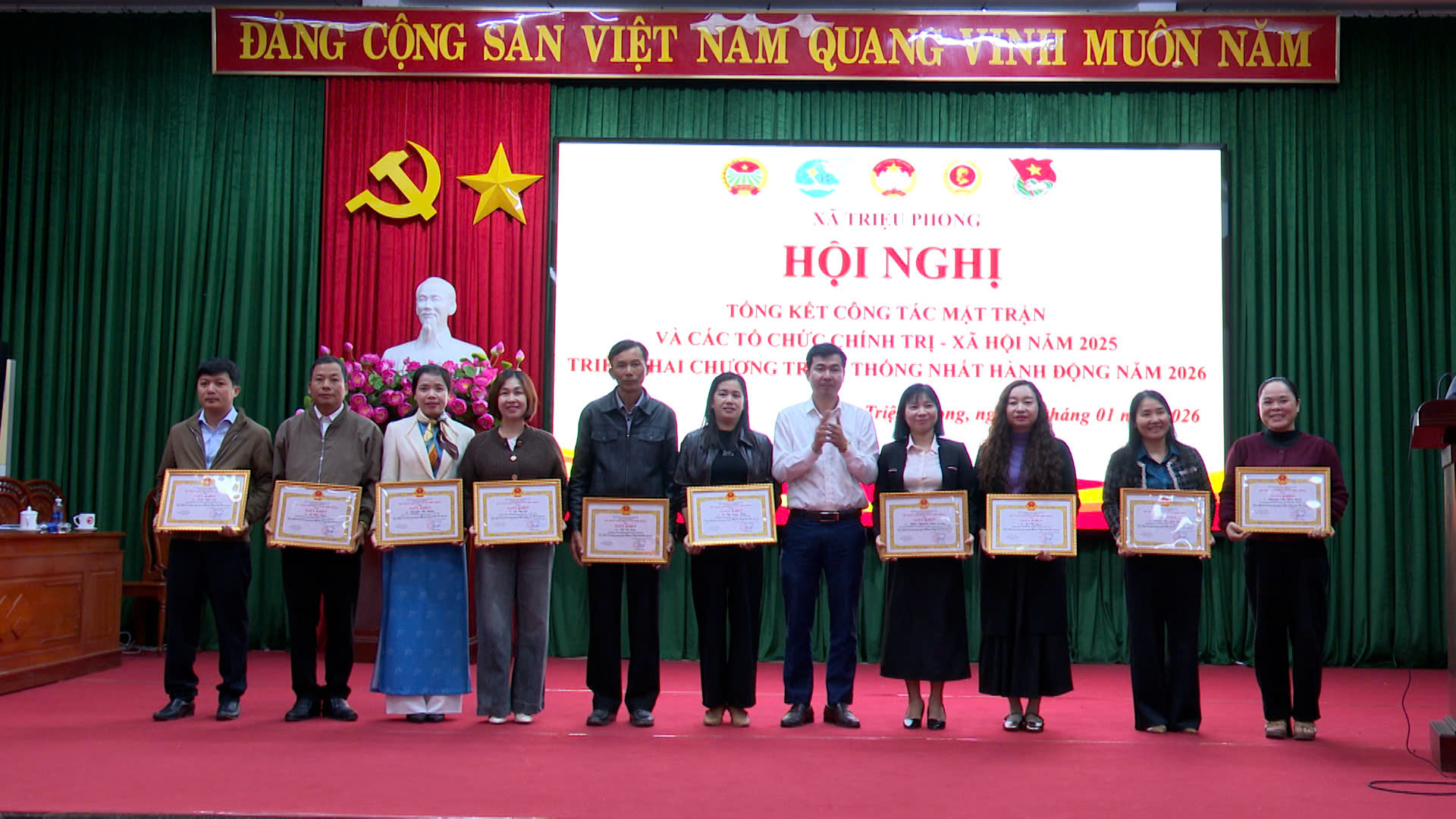 Hội nghị cũng là dịp ghi nhận, biểu dương những tập thể, cá nhân tiêu biểu. Theo đó, Ủy ban MTTQVN xã Triệu Phong được Ủy ban MTTQVN tỉnh tặng Bằng khen; UBND xã trao Giấy khen cho 11 tập thể và 20 cá nhân có nhiều đóng góp tích cực trong công tác Mặt trận và các tổ chức chính trị - xã hội năm 2025.”